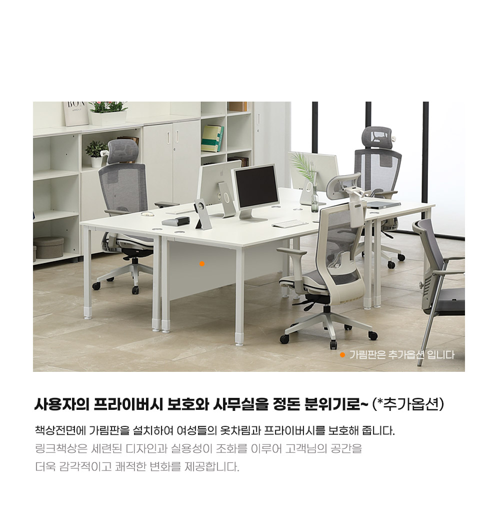 공간별/업무별 특성에 따라 스크린을 추가해 파티션 높이를 연장할 수 있고 책상 위에 파티션을 설치해 시선 차단과 팀원간 소통 등 다양한 형태로 만들어 줄 수 있습니다.